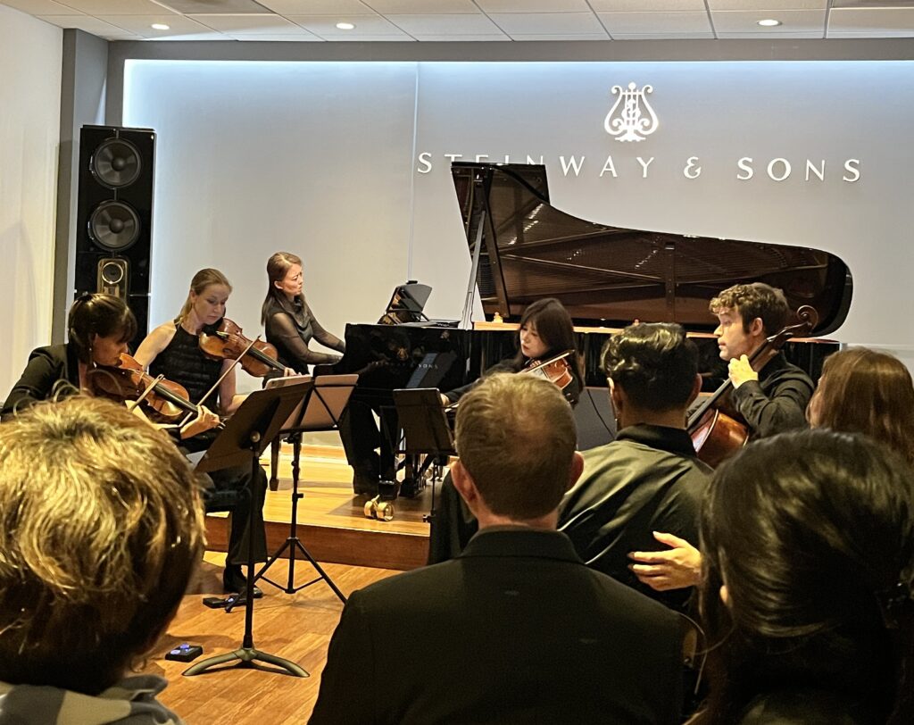 このスタインウェイギャラリーでは3週間前に独奏会も行っていて、その時もスタインウェイがショールームに置く自慢のフルコンで弾く気持ちよさを感じていたはずなのだけれど…弦と音が素直に混じる!思い通りのフレージングが自然にできる!音色の広がりが、奥行きが、もっともっとと探求心を掻き立てて、新しい歌いまわしや呼吸がどんどん開発されていく。調律が終わったのが18時半。開場が19時15分。一人でピアノに慣れている時間が全くなかったけれど、本番中に夢心地の気持ちよさ。(ああ、いつもこんなピアノで演奏できたら私はどんなにピアニストとしての奥行が深まるのだろう…ああ、毎日こんなピアノで練習出来たら私はどんなに…)本番二日目にしてここまで気持ちよくなってしまってよいのか?まだまだ先は長いぞ、まきこ!私の感動は他の奏者にも伝わっている。「Oh wow, Makiko…」みんなが褒めてくれる。