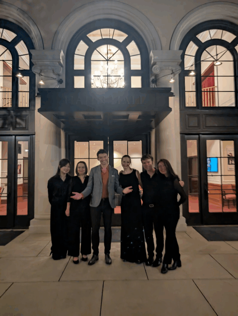 (写真:作曲家のFabien Waksman氏と奏者の皆とHahnホールの前で演奏終了後に)